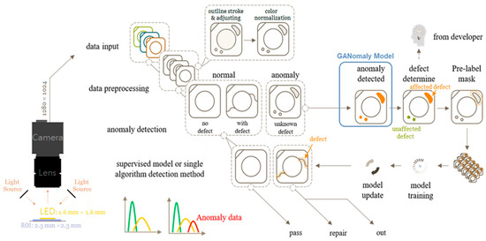 After data input and data preprocessing, an ordinary AOI system will generally use a basic algorithm [1,2,3] or a supervised model [4,5,6] as the inspection method. These methods require customization or huge amounts of training data and are only suitable for processing a predefined type of data. Unfortunately, with such a wide variety of products and production rates in a general factory setting, it is difficult to obtain sufficient anomaly data to train supervised models. This in turn makes it excessively laborious and time-consuming to customize each algorithm or to train each set of weights of the supervised model for a specific anomaly type.