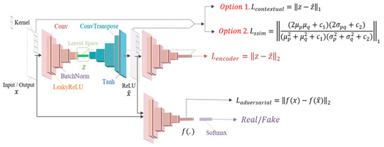 The backbone of our algorithm, as previously discussed, is GANomaly, which is an unsupervised generative confrontation anomaly detection model based on autoencoder and imported into a confrontation network. By using a conditional generative confrontation network, our algorithm converts high-dimensional training data images into latent space representations and uses the concept of the encoding/decoding model to reconstruct the images which contain the features of learning data. After that, the reconstructed images are graded by a scoring function, and the abnormal data are identified by delineating the normal zones. To help GANomaly focus on adjusting the data to normal, three loss functions are employed to standardize the operations of GANomaly. These three types of functions are: contextual loss, encoder loss, and adversarial loss. As shown in Figure 3 (drawn based on [11]), z is the latent space, and the contextual loss function compares the differences between the fake image generated from the autoencoder and the original image by L1 function (Option 1 in Figure 3). The encoder loss function compares the differences between two latent representations. One of the latent representations is generated by the encoder during the auto-encoding, and the other is generated by the same encoder of which the input is a fake image. The adversarial loss function compares the differences between the two latent representations generated by the encoder. One is generated from the real image and the other one is generated from the fake image. The function then operates the mini-max operation with the two intermediate latent representations and calculates the distance between these two function outputs. With the three loss functions mentioned above, the model can generate the features of normal data by training with only a few normal images.