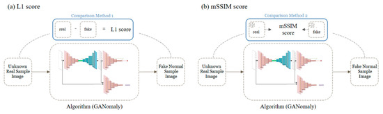 It is worth noting that the GANomaly architectures of GANomaly-SSIM-L1 and GANomaly-SSIM-SSIM are the same, so the same parameters will be used in the parameter optimizations process mentioned in the next section. As shown in Figure 4, two different comparison methods, L1 and mSSIM scores, are used to compare the unknown sample images and the generated fake normal sample images.