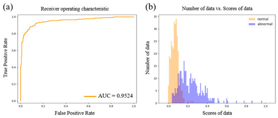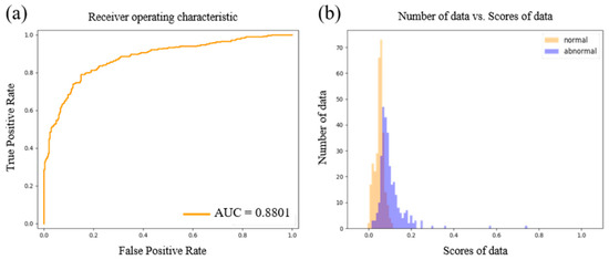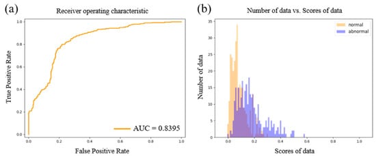 After the sufficient convergence, we obtained the better performance of the detection ability of AUC = 0.8801, as shown in Figure 6a. As seen in Figure 6b, the normal and anomalous score distributions are narrower than GANomaly-L1-L1, but the overlapping scores are lower. From these results, the impact of Problem 1, mentioned in Section 3.1, is reduced when the score function remains unchanged but is operating under a different model. The narrower score distribution is due to the better preservation of the individual normal features of the real image by the model so that the score distribution will be closer to the lower score during subsequent re-scoring. Compared with GANomaly-L1-L1, it is easier to identify abnormal blocks and generate fewer misjudgment events. Therefore, the overall performance is improved.