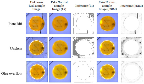 Those real sample images of three different defect types (plate rift, unclean, and glue overflow) can be used to generate fake normal images, labeled “Fake Normal Image (L1)” and “Fake normal Image (SSIM)” in Figure 8, corresponding to the first loss functions (L1 or SSIM) that the generative networks adopted. The discriminators then use the second loss functions to compare the fake normal sample images and the real sample images, and identify the abnormal pixels. Following this, the algorithms output L1 comparison results, labeled Inference (L1) in Figure 8.