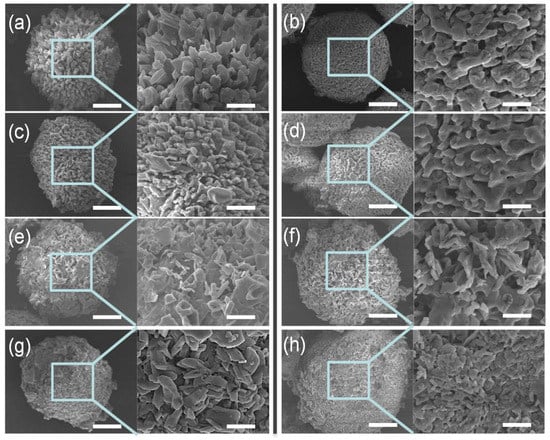 SEM images of the pollen-like mesoporous lactose particles with α:β ratios of (a,b) 1:0, (c,d) 3:7, (e,f) 5:5 and (g,h) 1:9, before and after ingredient loading. Scale bars: 5 μm (a–h) and 1 μm (enlarged images).