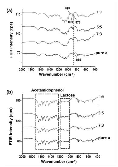 The identification of functional groups for lactose using FTIR has been reported by López-Pablos, et al. []. Since α-lactose and β-lactose are anomers, the α/β ratios can mainly be confirmed at the FTIR fingerprint regions (~1500–500 cm−1). From the FTIR spectra (Figure 2a), β-lactose anhydrous has a unique peak at 948 cm−1, where α-lactose anhydrous shows a unique peak at 855 cm−1. Moreover, the FTIR intensities at 899 and 876 cm−1 increase with the β-lactose content. This work suggests that FTIR could be used to roughly (difference in ratio: >20%) determine the ratio of α-lactose anhydrous over β-lactose anhydrous, although FTIR has been generally used to compare α-lactose monohydrate and β-lactose anhydrous [,]. Figure 2b shows the FTIR spectra of ingredient-loaded lactose samples, where acetamidophenol has a much higher intensity than lactose []. The loading efficiencies (weight ratio of ingredient over carrier, w/w, %) of acetamidophenol on lactose were only 30.6–33.4%, meaning that a large proportion of acetamidophenol had been adsorbed on the particle surfaces. The observation agrees well with the SEM results that surface morphologies of lactose microparticles significantly change after ingredient loading.