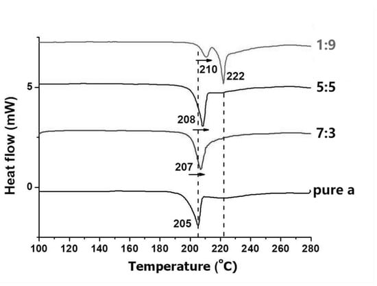 The post-glass transition has two melting peaks at 210 and 216 °C for α-lactose and β-lactose, respectively. The single peak is shown on the DSC curve (Figure 3) suggests that the pollen-like anhydrous lactose with an α/β ratio of 7:3 and 5:5 are α/β-lactose co-crystals. It is also suggested that the melting point of α/β-lactose co-crystal increases with the β proportion. When the α/β ratio of lactose is 1:9, two melting peaks are shown at 210 and 222 °C on the DSC curve for α/β-lactose and pure β-lactose, respectively. Based on the findings of α/β-lactose co-crystals, the 210 °C peak possibly cannot present the melting point of α-lactose, but it indicated that lactose molecule might exist in two ways. One was α/β-lactose co-crystal with a higher β ratio, and the peak of melting point appeared at 210 °C. However, due to the heat storage and the low heat transfer efficiency of the lactose co-crystals, another part of the pure β-lactose crystals underwent a slightly delayed endothermic process and reached its peak at 222 °C.