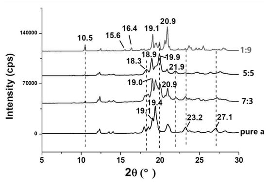 As shown above, lactose can crystallize into different crystal forms of α,β-lactose under different conditions. It is possible to form co-crystallization of α-lactose and β-lactose with different molar ratios, which is different from a mixture of α-lactose crystals and β-lactose crystals. XRD analysis was used to identify these α/β-lactose co-crystals. The X-ray powder diffraction patterns of lactose crystal types include diffraction patterns of α-lactose monohydrate, anhydrous α-lactose, anhydrous β-lactose, anhydrous forms of α- and β-lactose in molar ratios of 5:3 and 4:1, which are co-crystallizations of α-lactose and β-lactose with different molar ratios and anhydrous β-lactose containing 26% α-lactose monohydrate according to the previously reported literature [,,].