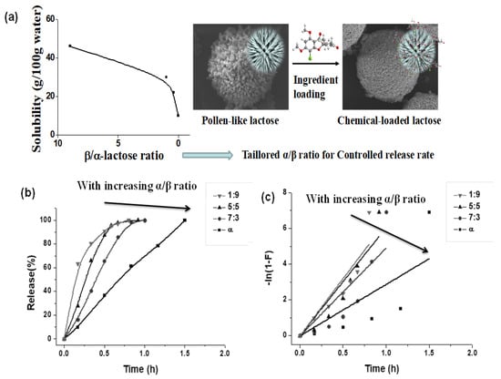 Figure 6a shows the schematic diagram for the mechanism of controlled release by tailoring α/β ratio of lactose. Since the solubility of β-lactose is about five times that of α-lactose at room temperature [], the dissolution rate of pollen-like lactose relies on the α/β ratio of lactose. High ratio of α-lactose over β-lactose suggests a slow dissolution of the lactose carrier. Figure 6b shows the release profiles of acetamidophenol from the lactose-carried tablets with tailored α/β ratio of lactose. Overall, the release rate of acetamidophenol is lower for tablets of high α/β ratios. Acetamidophenol has been totally released in 1.5 h from the pure α-lactose carrier, whereas the release times are within 1 h for the other carriers. Linear fitting has been performed for the release profiles using the first-order release model [,] with intercept fixed at 0 (Figure 6c). Table 2 showed the fitting parameters for the release profiles using the first-order release model.The first-order release constants (k, h−1) for the pollen-like lactose tablets have been determined to be 2.87, 4.91, 6.06 and 6.39, showing an increasing order as the α/β ratio decreases from pure α to 1:9.