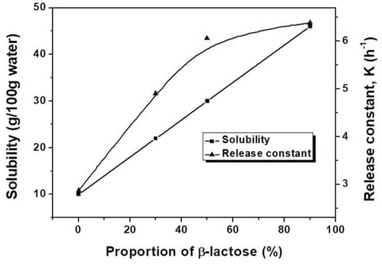 High values of R-squared are found (>0.9) for the samples with more β-lactose (>50%), since high solubility results in a fast dissolution of lactose carrier. It is suggested that release profiles of loaded ingredients can fit better with the first-order release model when the lactose carrier has less influence of preventing the tablet from dissolution. Figure 7 shows the changes of lactose solubility (at room temperature) and first-order release constant (k, h−1) as a function of the proportion of β-lactose in pollen-like lactose carrier. The figure benefits future works of designing lactose carriers for controlled release rates by tailoring the optimal α/β ratio of lactose. Moreover, the first-order release constant, k, can also be used to calculate the drug release rate (rt = k·Qo·e−kt) at time ‘t’, the cumulative amount of drug release (Qt = Qo·e−kt), and the fraction of released drug (F = 1 − e−kt) [].