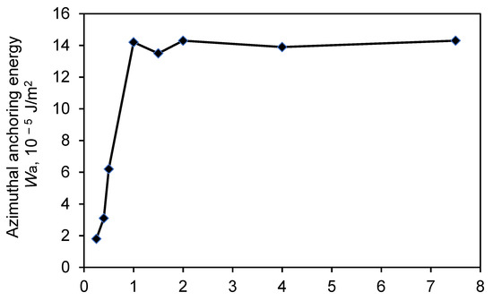 In uniaxial liquid crystals (LCs), the director is defined as spatiotemporal average of the optical axis direction of each molecule. The orientation of the LC director within the cell is surface mediated, and depends on the azimuthal and polar anchoring energies of LC with the surface. In the absence of the external agent, interaction between the surface and LC imposes preferred direction on the director in the equilibrium state, known as the easy direction axis. If one of the substrates is covered with a photosensitive material (e.g., azo dyes SD1 or AD1), then LC’s anchoring energy is controlled by the exposure energy. Consequently, the twist angle of the director will achieve adjusted equilibrium value [10]. This is essential to get acceptable optical contrast (higher than 8:1 [10]) and a variety of gray levels. Azimuthal anchoring energy of nematic LC with the azo dye-treated surface can be controlled through the exposure time, and it is estimated to be (2–14)·10−5 J/m2 (see Figure 1). Consequently, the twist angle can be controlled, which results in generation of gray levels [6,11].