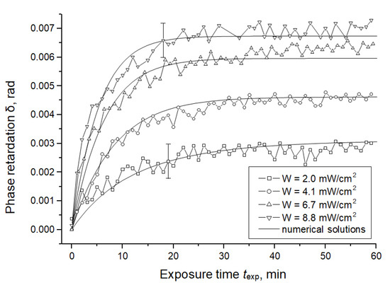 Dependence of photoinduced phase retardation on the exposure time for various powers per unit area (W) of the irradiated UV-light. Solid lines indicate numerical solutions, which were obtained by using rotational diffusion model.