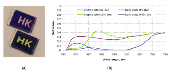 Several interesting features are observed if LC is doped with a fluorescent dye [7]. Depending on the type of fluorescent dye, the reflected light spectrum can have high intensity of green fluorescence, whilst blue light is absorbed. Moreover, the fluorescent dye enhances the twisted state (i.e., dark state) of ORW e-paper (see Figure 4a). In other words, the intensity of blue light (peak wavelength ~430 nm) decreases in the reflectance spectrum, consequently, the contribution of green light (peak wavelength ~520 nm) increases [16]. It all provides enhancement of the dark state (see Figure 4b).