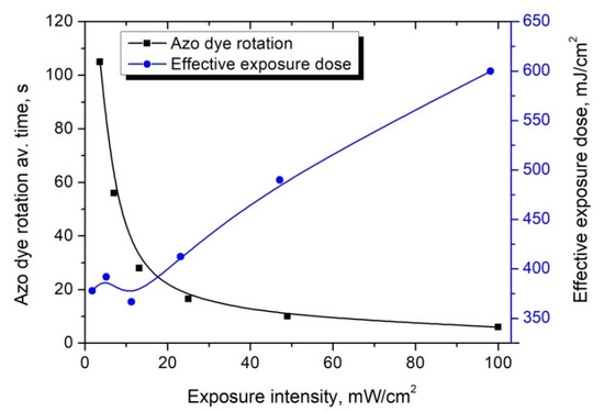 Note that the product between the average azo dye reorientation time and the corresponding exposure intensity determines the effective exposure dose. Interesting phenomenon of the effective exposure dose dependence versus the light intensity is observed within the range of ~0–20 mW/cm2, i.e., the effective exposure dose is fairly constant (367 mJ/cm2). Meanwhile, when the intensity higher than 20 mW/cm2, the exposure dose exhibits linear behavior. A probable interpretation of this phenomenon is non-constant rotational diffusion coefficient of azo dye molecules. However, this issue is not investigated.