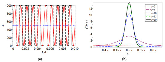 Let us study model (1) for different pump signals A(t) (see Figure 6a). The subsequent substitution of these pulses into the Boltzmann–Smoluchowski Equation (1) shows that the time, which is required to achieve the saturated form of the probability density function depends on the mean value of the intensity during the cycle. In other words, the curves in Figure 6b for the given instants of time depend on the mean intensity. In practice, these pulses can be modulated with a light-emitting diode.