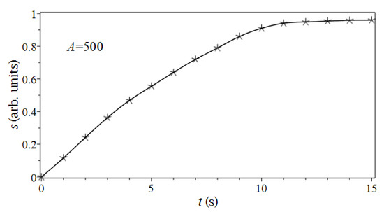 When the probability density function is known for the considered time domain, is it possible to calculate kinetics of the relative order parameter, which is defined as follows: . The computational technique includes obtaining the values of , I = 1…20 at the sampled points for the given instants of time, which were interpolated by splines. The obtained analytical expressions of the probability density functions were substituted into the definition of the order parameter (see Formula (2)), and then the relative order parameter was calculated asterisk symbols in Figure 7.