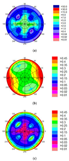 Consider a LC layer with average elastic and optical parameters (e.g., 5CB) of thickness 13.3 μm. In order to simulate light-reflecting characteristics of ORW e-paper, one must consider its composite layered structure (e.g., [6,25]), where dark and bright states are obtained by changing the mean director twist angle between polarizers (see Figure 3). All performance characteristics of e-paper can be modelled by using the optimizer MOUSE LCD [26]. With the assistance of the tool “Angular Characteristics” of MOUSE-LCD, one can obtain the contrast ratio versus viewing angles. The isolines in Figure 8a show almost symmetric dependencies of the contrast ratio with the mean result of 8:1. Simulations of the reflectance coefficient for bright and dark states (Figure 8b,c), respectively) demonstrate acceptable reflectance coefficient (>0.3) at the normal observation angle and very good dark state, which gives acceptable contrast ratio. After carrying out simulations with different polarizers, we have found that its fairly homogeneous light transmittance spectrum in the visible range improves the contrast ratio and reflectance coefficient.