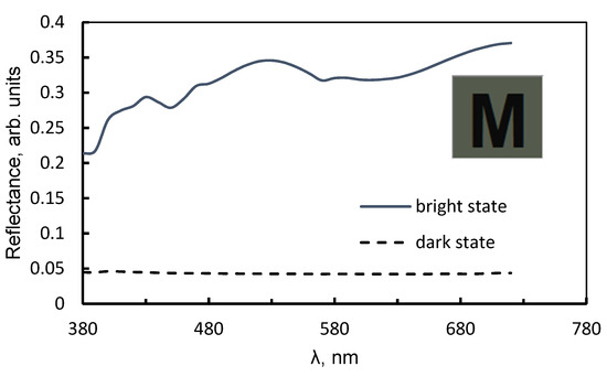 Qualitative comparison between computer-generated image in the insert of Figure 5 and experimental images [8,25] shows its similarity for non-reflective states. However, the previously achieved value of the reflectance coefficient was about 0.43 [6]. Thus, by setting time-limited exposure, the reflectance coefficient decreases by ≈24%.