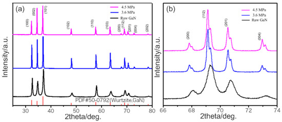 (a) XRD patterns of standard wurtzite GaN, GaN powders and as grown GaN polycrystals obtained under different pressure, (b) The peak of (200), (112), (201) and (004).