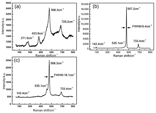 The Raman spectra of GaN raw powder and crystals obtained under different pressures are shown in Figure 4. The peaks are observed near 567 cm−1 and 733 cm−1 in all GaN crystals, which are in good agreement with the reported E2 (high) and A1(LO) phonon modes [23]. The peak position of E2 (high) is sensitive to the internal stress of GaN crystal. The position of 567 cm−1 corresponds to GaN crystal without internal stress [24]. It indicates that the crystals are nearly stress free. Moreover, the full-width at half-maximum (FWHM) values of this peak of GaN crystals grown under 3.6 MPa and 4.5 MPa are about 6.4 cm−1 and 18.1 cm−1, respectively. It indicates that the crystals obtained at 3.6 MPa have higher structural quality or lower impurity concentration. The peaks of 142.4 cm−1 and 535.1 cm−1 are found in grown GaN crystals, which are corresponding to the E2 (low) and A1 (TO) phonon modes, respectively [23]. The peak of 423.9 cm−1 is found in the GaN powder, which are corresponding to the A1 phonon mode. In addition, unknown peak was found at 271.5 cm−1, which may be related to defects.