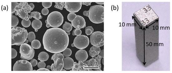 Gas-atomized Hastelloy-X powder (EOS, Krailling, Germany) with the chemical composition included in Table 1 was used in this study. A field-emission scanning electron microscopy (FE-SEM; JIB-4610F, JEOL, Tokyo, Japan) image of the Hastelloy-X powder is displayed in Figure 1a. The particle size distribution was determined as D10 = 17.4 μm, D50 = 33.9 μm, and D90 = 63.1 μm, using a Mastersizer 3000 (Malvern Panalytical, Malvern, UK). The flowability, measured by a Revolution (Mercury Scientific, Newtown, CT, USA), was 14.68 mJ/kg for the avalanche energy, 45.1° for the avalanche angle, 34.3° for the rest angle, and 1.87 for the surface fractal.