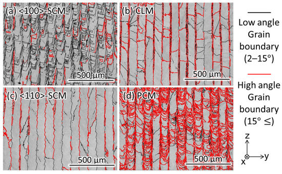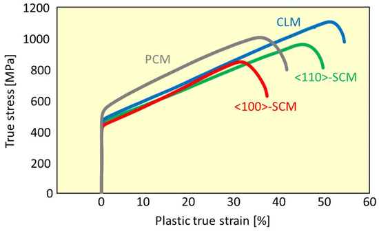 The Schmid factors (SF) for the loading axes <100> and <110> were both 0.408. As CLM can be regarded as a composite microstructure consisting of main layers with <110>//BD orientation and sub-layers with <100>//BD orientation, the theoretical SF is also 0.408. Here, the 0.2% proof stresses of <100>-SCM and <110>-SCM were 419.2 ± 3.5 and 419.9 ± 13.5 MPa, respectively, which is consistent with the identical SFs. The higher work-hardening rate for <100>-SCM may be due to the higher frequency of dislocation pile-up associated with multiple slips, as the loading axis parallel to <100> is not accompanied by crystal rotation, but by an 8-fold multiple slip during tensile testing [49,50]. However, the 0.2% proof stress of CLM was 434.1 ± 12.2 MPa, higher than that of the <100>-SCM and <110>-SCM, despite the theoretically identical SF. PCM demonstrated the highest 0.2% proof stress of 493.1 ± 13.3 MPa. As illustrated in the grain boundary maps of Figure 6d, it was determined that the proof stress obeys the Hall–Petch relationship.