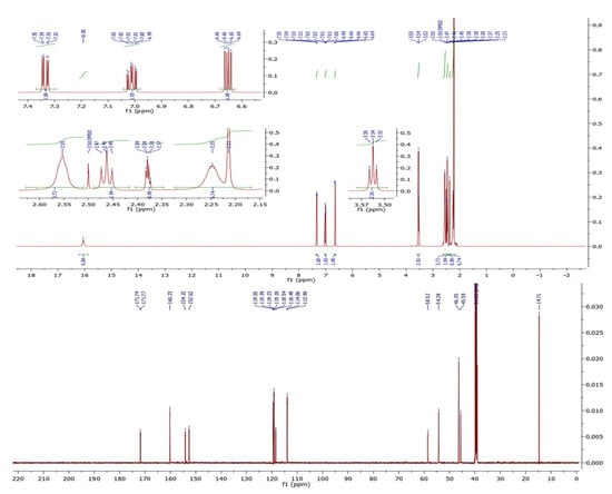 All resonances for the predicted structure were confirmed by 1H-NMR spectroscopy in DMSO-d6. A singlet peak at 2.21 ppm was attributed to the three protons of the methyl group. The N-H of piperazinyl ring was found as a multiplet peak at 3.54 ppm, whereas the two methylenes of piperazinyl moiety were noticed at 2.25 (br, 2 × CH2NH) and 2.55 (br, 2 × CH2N) ppm. Moreover, the protons of the two aliphatic methylene groups were detected as expected as triplets at 2.46 (CH2N) and 3.54 (C=NCH2) ppm. The three aromatic protons were observed at 6.65 (d), 6.99–7.03 (m) and 7.33 (s) ppm. Notably, a broad peak in the extremely downfield region, specifically at 16.05 ppm, was assigned to the phenolic proton. All the corresponding aliphatic, aromatic and iminic carbon signals were displayed in the 13C-NMR spectrum at the anticipated range of chemical shifts, as exemplified in Figure 1.