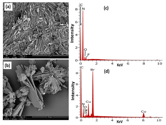 The GC-MS spectrum of the ligand reflected the fragments with the expected molecular formula, while the CHN elemental analysis of N,N,N,O-tetradentate ligand and its complex 1–3 were fitting with the acceptable range of the proposed molecular formula and structures (Scheme 1). Likewise, Scanning Electron Microscopy (SEM) revealed the morphology of the ligand as irregular rod-shaped microstructure, whereas a micro-flower made of micro-sheets (larger than 10 μm) was matured by the Cu(II) complex, Figure 3a,b. These two materials were further analyzed via Energy Dispersive X-ray EDX. The SB-functionalized ligand reflected the presence of C, F, N and O atoms; however, additional Br and the three characteristic signals of Cu atoms were detected by complex 2 (Figure 3c,d).