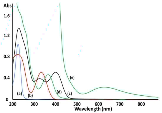 The UV-Vis absorption spectra of the 2-(1-piperazinyl)ethylamine, 5-fluoro-2-hydroxyacetophenone, tetradentate ligand and complex 2 were measured in neat methanolic solution in the spectral region of 200–900 nm at ambient temperature. A maximum absorption in the UV area was recoded at 223 nm for the free amine, resulting from n-σ* electron transition, however, two broad bands were exhibited by the acetophenone derivative at λmax = 227 and 338 nm ascribed to n-σ* and π-π* electron transfer, respectively (Figure 4a,b). A broad band at λmax = 232 along with two maximum absorptions at 329 and 404 were displayed by the ligand, these electronic transitions could be assigned to n-σ*, π-π* and n-π*; the last electronic absorption designates the formation of the ligand through the condensation process, (Figure 4c). On the other hand, complex 2 exhibited two electronic transitions, a strong band with two shoulders at 240 and 265 nm, which were assigned to n-σ*, while the second wide peak at λmax = 370 nm could be resonated to ligand-to-metal charge transfer (LMCT), Figure 4d []. Hence, the coordination of the tetradentate ligand to copper metal center is well designated by this spectral pattern. Moreover, the d-d absorption was presented in the visible area at λmax = 675 nm, using a concentrated solution of the copper complex (Figure 4e), this outcome is in consistence with alike described complex systems [,,,,,].