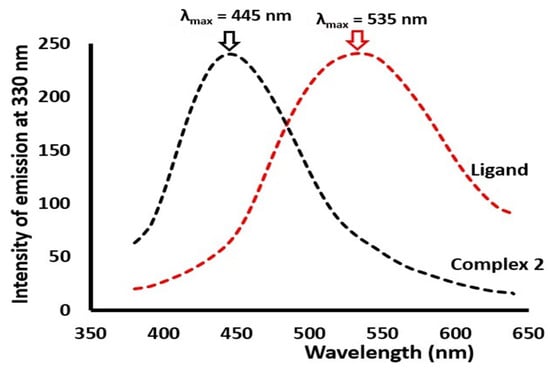 The emission spectra of 1 × 10−5 M of the tetradentate ligand and its Cu(II) complex (complex 2) were measured at 330 nm excitation, as shown in Figure 5. It was noted that the maximum intensity of the ligand occurred at λmax = 535 nm, whereas complex 2 displayed the highest emission at λmax = 445 nm. Such a blue shift (Δλ = 90 nm) in emission is mainly resulting from ligand-Cu(II) coordination, where a typical increase in the energy gap is expected to occur as a consequence of the coordination of NNNO− to the copper metal center.