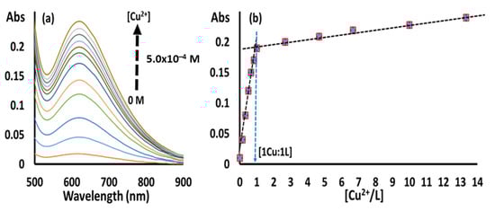 The halochromism for complex 2 was investigated in pure DMF to demonstrate the reversible chromic turn off-on activity of the complex. It was observed that upon the addition of HCl, the green-colored solution was changed to colorless (turn-off) due to the protonation process of the ligand that caused a de-structured of the complex. However, the addition of NaOH solution to the previous mixture regenerated the initial green color (turn-on) due to the de-protonation of the ligand, a process that re-structured the complex. The band intensity of d–d transition at λmax = 625 nm began to steadily decrease with increase in HCl concentration without noticeable wavelength shifting as shown in Figure 7a. Therefore, the disappearance of the green color could be ascribed to the protonation of the coordinated ligand, which causes the de-structuring process. The de-colorization process was pursued by spectrophotometric titration, revealing a consumption of mainly four equivalent protons from HCl at λmax = 625. This outcome agrees with the protonation nature of the tetradentate ligand to furnish the protonated ligand [,,,,,,,,,,,,] and the hydrated copper salt (CuBr2) (Figure 7b).