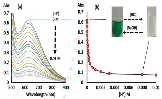 [H+]-dependent visible spectra of complex 1 in water at RT (a) and Abs. vs. [H+] relation at constant λmax = 625 nm (b).