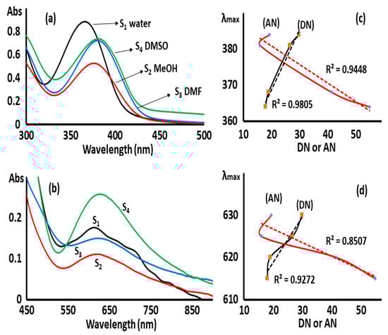 Solvatochromism of complex 2: Abs. vs. λmax at LMCT (a) and at d-d (b), λmax vs. solvents DN/NA at LMCT (c) and at d-d (d).