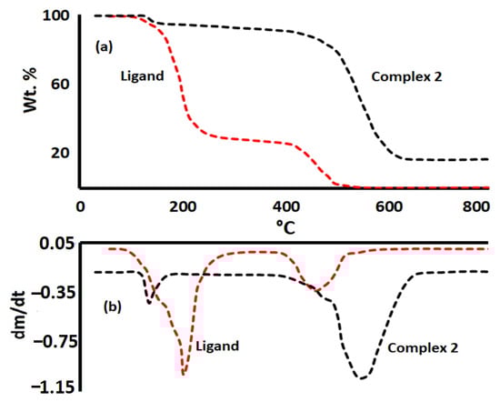 TGA (a) and DTG (b) of the tetradentate ligand and complex 2.