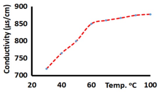 The electrolytic conductivities of the aqueous solutions (8 × 10−5 M) of complexes 1–3 at 22 °C were found to be 644, 722, and 525 µS/cm, respectively. Aqueous solutions of copper precursors (CuCl2, CuBr2 and Cu(NO3)2) were found, as expected, to display conductivity values compared to their corresponding complexes. These observations support the expected presence of mono-halide or mono-nitrate coordinated to Cu(II) centers. Notably, the increase in temperature from 22 to 100 °C of 8 × 10−5 M solution of complex 2 reflected an increase in the ionization percentage, which in turn increased the conductivity of the aqueous solution of the complex as exemplified in Figure 10