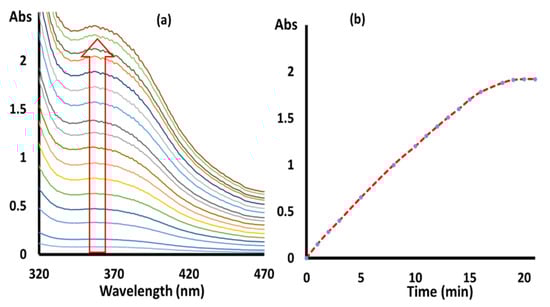 It is worth mentioning that plenty of sustainable catalytic oxidation reactions have been performed in the presence of molecular oxygen and hydrogen peroxide as oxidants []. However, peroxide is largely used for having higher oxidation potential than oxygen [,,,,,,,]. Initially the catalytic oxidation of o-catechol to o-benzoquinone was perused using UV-Vis spectroscopy, in which in the recorded absorbance values at 358 nm of the o-benzoquinone were time dependent, measured every one minute for 20 min using complex 3 (Figure 11).