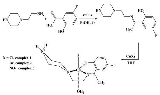 A solution of 3.60 mmol of each of the three copper(II) salts dissolved in 10 mL THF was poured into a solution of 3.60 mmol (1.00 g) of (E)-4-fluoro-2-(1-((2-(piperazin-1-yl)ethyl)imino)ethyl)phenol in 15 mL of warm THF with stirring. The color of the reaction mixture changed to green before a precipitate started to appear. Stirring was continued for 20 min at ambient temperature to ensure completeness of the reaction. The produced metal complex was filtrated off, washed with ethyl ether and n-hexane, and then dried under reduced pressure.