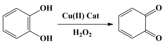 The synthesized copper complexes were examined as catalytic oxidizers for o-catechol as a model substrate to o-benzoquinone employing hydrogen peroxide as an environmentally friendly oxidant as shown in Scheme 2.