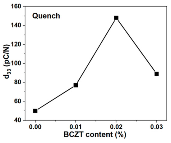 - Lee, M.H.; Kim, D.J.; Choi, H.I.; Kim, M.-H.; Song, T.K.; Kim, W.-J.; Do, D. Thermal quenching effects on the ferroelectric and piezoelectric properties of BiFeO3–BaTiO3 ceramics. ACS Appl. Electron. Mater. 2019, 1, 1772–1780. [Google Scholar] [CrossRef]