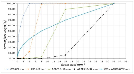 All these fractions of converter steel slag (CSS) and (ACBFS) shown in Table 4 were subjected to granulometric analysis according to EN 933-1 []. Based on the performed tests and with the aid of C-Packing software, the optimal grain size curve of the combination of steel slag and ACBFS of fraction 0/32 mm was developed, which consists of CSS 0/4 mm (32.0%), CSS 4/8 mm (18.0%), ACBFS 8/16 mm (20.0%), and ACBFS 16/32 mm (30.0%). It follows from the above that the ratio of the filler−steel slag (CSS) and ACBFS is 50:50%. Based on the results of the granulometric analysis (see Figure 1), the mean grain size was determined as d50 from the individual grain size curves (see Table 5).
