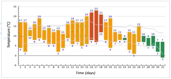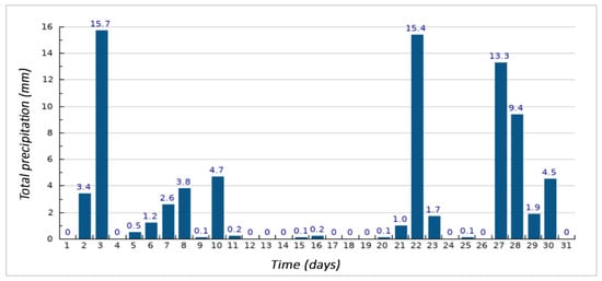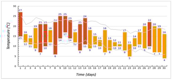 Test specimens made in stage II were placed in an outdoor environment of the company Považská cementáreň, a.s. in August, September, and October 2017. To define the outdoor environment, we present the highest and lowest temperatures during individual months (see Figure 2, Figure 3 and Figure 4), where the grey line shows long-term averages for the given day. Furthermore, precipitation totals in individual months are shown in Figure 5, Figure 6 and Figure 7.