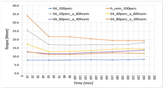 The result of the measurement is the measured torque (Nmm) over time. The comparative cement was Portland blended cement (CEM II/B-S 42.5N). From Figure 8, it is clear that with the replacement of Portland blended cement by H-CEMENT in 20, 40, 60, and 80%, the workability deteriorates, which may affect the properties of the fresh concrete mixture. Based on the presented results, it was found that with 20 and 40% replacement of CEM II/B-S 42.5N by H-CEMENT, the workability was the least affected. Based on the obtained results on the rheology of the cements used for the production of the concrete mixture based on steel slag (CSS) and (ACBFS), a 30% replacement of CEM II/BS 42.5N by H-CEMENT was chosen, where H-CEMENT was used as a mineral addition II of the kind denoted PUZZOLANIT. Determination of the rheology of the used cement was made according to the methodology of Považská cementáreň, a.s.