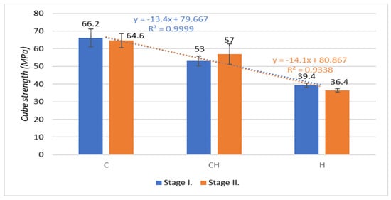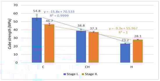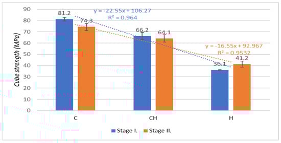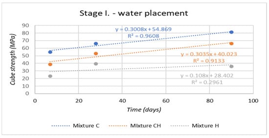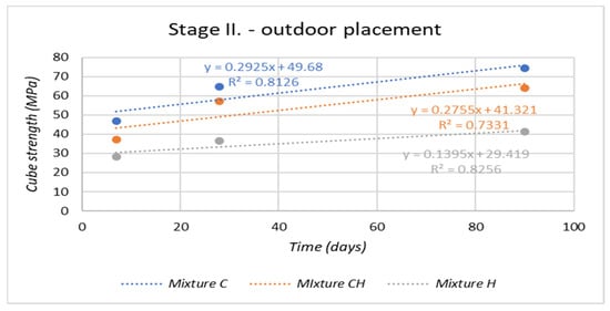 Figure 10 shows the results on cube strengths after 7, 28, and 90 days of aging of test specimens from the second stage of production of test specimens, which were placed outdoors. An increase in cube strengths is evident in all test specimens prepared according to the experimental mixture designs. However, when comparing the coefficient of determination of the experimental mixes, where the test specimens were placed in aqueous and outdoor environments, it is clear that the outdoor environment in which test specimens were placed caused the value of the coefficient of determination to decrease for mixture C to R = 0.90 and for mixture CH to R = 0.86. In contrast, an increase in the coefficient of determination was found in test specimens made from the H-CEMENT-based mixture H to the value R = 0.91.