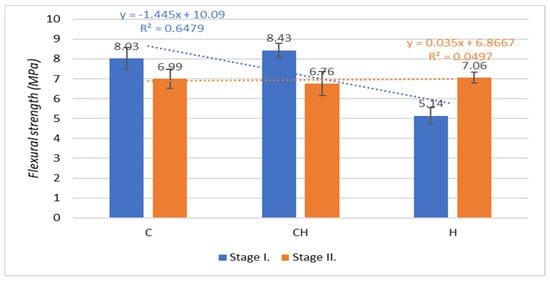Figure 14 presents the results on the strength of the concrete based on steel slag (CSS) and air-cooled slag (ACBFS) prepared according to the experimental formulas. The flexural strength of the concrete was tested on prisms with dimensions of 100 × 100 × 400 mm3 after 28 days of aging of the test specimens. It is evident that the outdoor placement of the test specimens caused the flexural strength of all experimental mixtures to be equalized (C, CH and H). In the aqueous environment, the trend of a decrease in flexural strength is evident with a coefficient of determination value of R = 0.80.