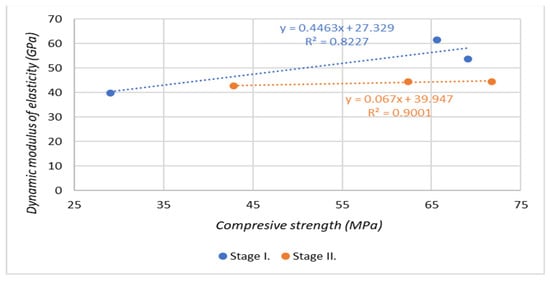 Figure 15 presents the dependence of the dynamic modulus of elasticity on the cube strength. The dynamic modulus of elasticity was determined after 28 days on prisms with dimensions of 100 × 100 × 400 mm3. We found that the test specimens that were placed in an aqueous environment showed a dependence where an increase in compressive strength is accompanied by an increase in the value of the dynamic modulus of elasticity with the value of the coefficient of determination R = 0.91. For test specimens that were placed outdoors, a slight increase in the dynamic modulus of elasticity with the value of the coefficient of determination R = 0.95 is evident.