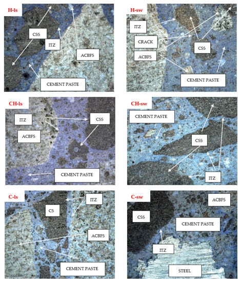 Images of concrete based on blast furnace slag (ACBFS) and steel slag (CSS) magnified 62×. The samples marked H, CH, and C-ls were placed outdoors environment. The samples marked H, CH, and C-sw were placed in sewage water.