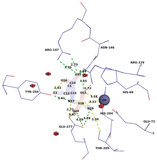The sulfamoyl part of SVal had a tetrahedral configuration that simulated sp3-hybridized C-atom configuration in a complex with the substrate. The sulfamoyl binding mode was similar to those found in previously reported CPA—SPhe (PDB ID: 1IY7 [32] and CPT– SLeu (PDB ID: 6GO2 [16]) complexes. The SVal side chain was anchored in the S1′-subsite, which is the pocket of the primary substrate specificity of the CPT. The environment of the SVal molecule in the active site of CPT is shown in Figure 1. Glu277 acts as a general base catalyst that deprotonates water molecule (O20), and Zn ion activate carbonyl oxygen imitated by N19. Arg129 and Tyr255 participate in the stabilization of transition-state by bonding with an oxygen atom (O21 in sulfamoyl analog) and nitrogen (N17 in SVal) corresponding.