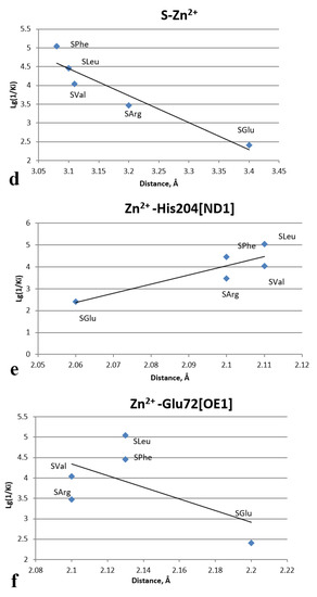 Earlier, such a correlation between bond lengths and inhibition constants/catalysis efficiency constants were obtained for SLeu, SPhe, SArg, and SGlu inhibitors and O21-R129NH1, O21-Zn2+, N19-T205 (O), S-Zn2+, N17-E277OE2, O16-Y255OH bonds. Though, the Ka value can both increase and decrease with increasing bond lengths.