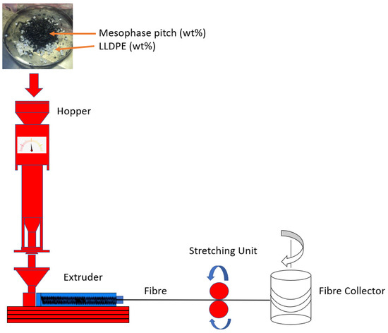 A Noztek Pro Filament single-screw melt fibre spinning extruder was used. Details of this and the fibre collection are given in our previous paper [35]. The nozzle was 0.5 mm in diameter and 1.5 mm in length. The extruder was set to 315 °C and at a 2.5 m/min extrusion speed, with the stretching speed set to 2.5 m/min. To obtain different fibre blends, pitch and PE were fed into the extruder in different ratios. The manufacturing processing stages are shown in Figure 1. The sample designation for the different proportions is LLDPE (x) wt% and MP (100-x) wt%. Figure 2 is a diagrammatic representation of cold stretching.