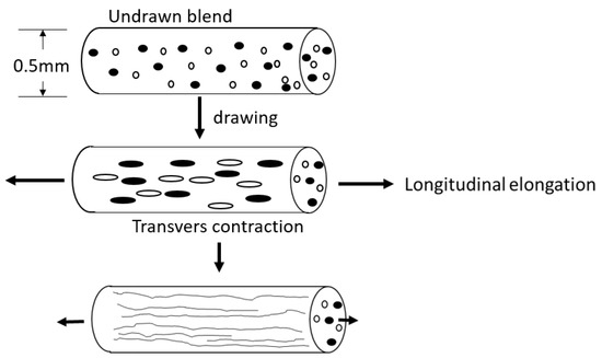 Melt blends cold drawn to make fibres; discontinuous pitch domains are stretched from spheres to ellipses.