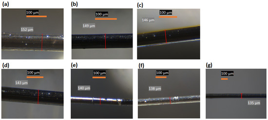 Images of LLDPE/MP fibres taken using a Nikon ECLIPSE ME600 optical microscope: (a) LLDPE 30 wt%, (b) LLDPE 40 wt%, (c) LLDPE 50 wt%, (d) LLDPE 60 wt%, (e) LLDPE 70 wt%, (f) LLDPE 80 wt%, and (g) LLDPE 90 wt%.