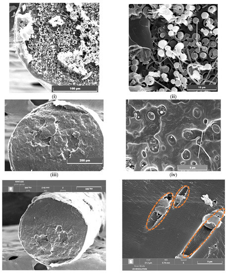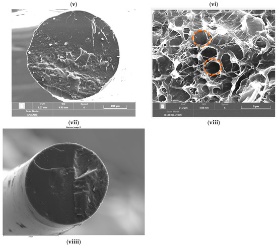Pitch fibres tend to generate microfibrils within their fibres, as shown in the SEM images [42]; also see Figure 4i–viii, and Figure A2 for LLDPE/MP blends in the range of between 30 and 100 wt% of LLDPE. The MP molecules show a strong preference to align themselves with the longitudinal fibre axis, and this process has a tendency to begin in the liquid crystalline phase [11]. This could be the reason for micro-fibre development in our samples. As the LLDPE wt% content of the LLDPE/MP fibres increased to about 60%, the development of microfibres inside the blend was significantly reduced; see Figure 4iii,iv.