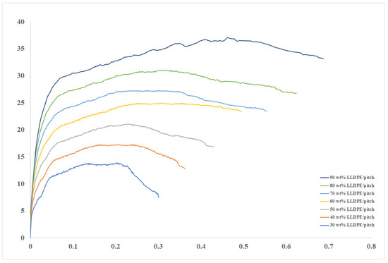 The stress limit of extruded neat LLDPE is typically about 40 MPa, and the typical strain will be about 0.8 which suggests that the LLDPE component in LLDPE/MP fibres has an important load-bearing role, and toughens the material [39]. Figure 5 shows that boosting the wt% LLDPE in relatively brittle LLDPE/MP fibres can be significant.